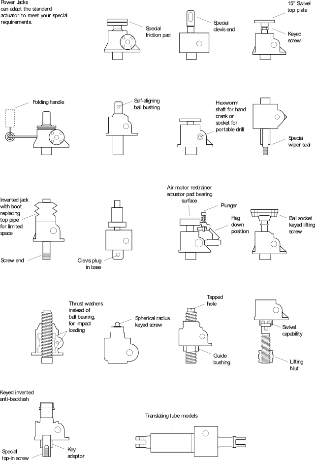 This would include non-standard painting or plating of the housing, 2 or 3 start threaded lifting screws, stainless steel lifting screws or worm shafts, increased closed heights, extended worm shafts, opposite threading of lifting screws, etc.